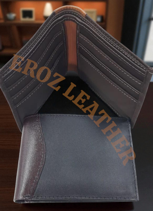 Esta billetera de doble pliegue (bi-fold) de EROZ LEATHER combina la funcionalidad clásica con un diseño moderno de contraste, ideal para el hombre que busca estilo sin sacrificar la practicidad.